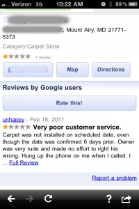 I was looking up carpet companies on my iPhone a week or two ago and came across the photo on this blog post (Click to enlarge). I was looking for a carpet company by my home and clicked on this one companies’ only review they had on Google Places. It was a